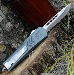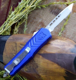 CobraTec Blue FS-X OTF Knife CTKMBLUFS-XMTS, 3″ D2 Steel Tanto Serrated Blade, Blue Aluminum Handle