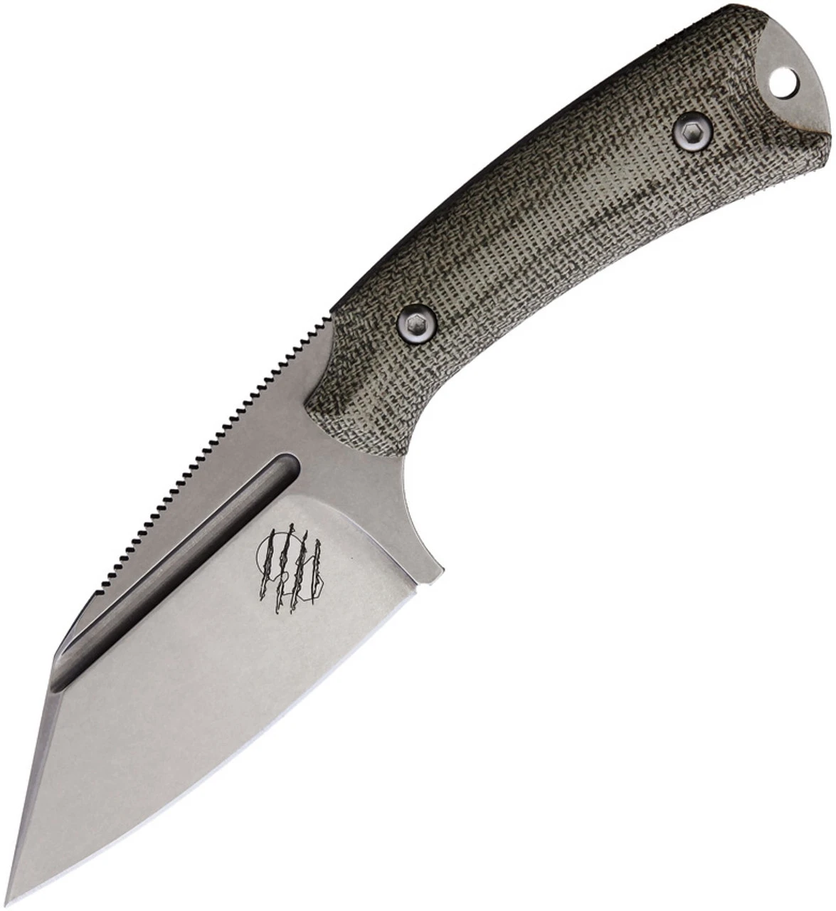 The Akeron La Sanction is the collaboration between Bastinelli and Akeron. This compact tactical fixed blade design features stonewash finish Bohler N690 Stainless wharncliff blade. Full extended tang, Green Canvas Micarta handle w/lanyard hole comes with black kydex sheath.