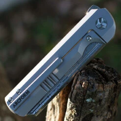 The Slimfoot is a robust pocket knife built with 6AL4V Titanium handles a sheepsfoot blade. It sports low-key jimping on the Ti backspacer and subtle machining that adds character to the handle. The flipper has functional jimping, the detent is precise, and the blade flies open with ceramic ball bearings around the pivot. A fuller runs the length of the blade and a chamfer accents the spine. The frame lock includes a steel lockbar insert for longterm wear. This pocket knife rides tip-up with a Titanium pocket clip. Includes standard Torx hardware for simple maintenance