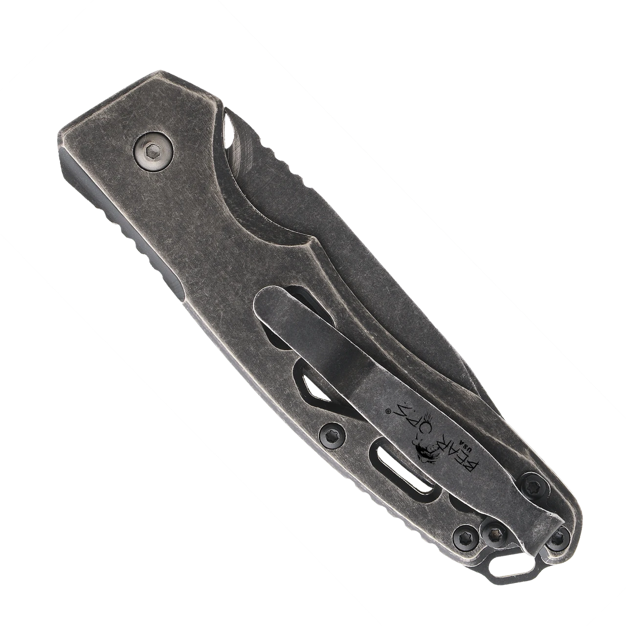 The Bear Ops AC-1200-Ti-SW is part of the Bold Action® XII series. The Modified Drop Point Bold Action® XII pattern features a Hollow Ground 2-7/8” blade edge that is made with 154CM Premium Steel, allowing this auto to be corrosion resistant and tough with a great edge retention. The blade opens with a firm push of the recess button and a safety is present to prevent accidental deployment. The Titanium Stonewash 4″ Handle features a Pocket Clip that provides for tip-up carry and quick access. The Bear Ops AC-1200-Ti-SW features jimping on the top of the blade and handle and an index finger groove for a more secure grip. A lanyard spacer is also present for fastening and secure storage. The Bear Ops AC-1200-Ti-SW has an overall length of 6-7/8″ and weighs only 2.8 ounces due to its skeletonized design. Bold Action® XII is proudly made in the USA.