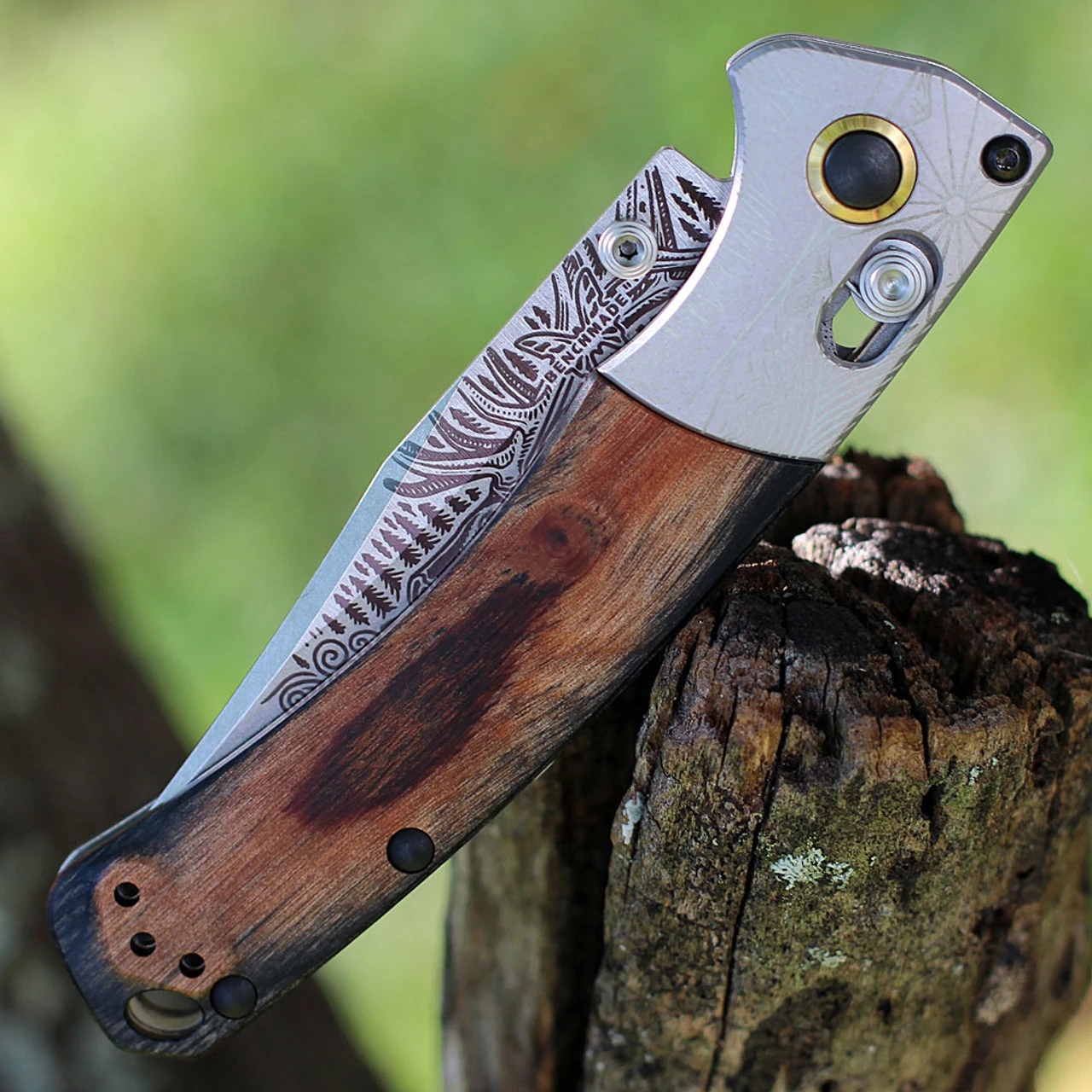 Benchmade 15085 Limited Edition Artist Series – Bull Elk (15085-2201) 3.40″ CPM-S30V Satin Clip Point Embellished Blade, Wood Handle