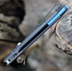 - Dual blue-finished titanium thumb studs with bronze pivot washers.