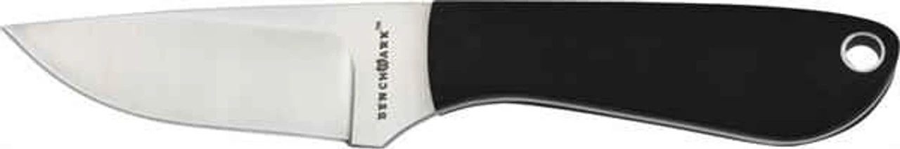 BenchMark Neck Knife. 6″ overall. 2 7/8″ stainless blade. Full tang. Black micarta handles. Molded black Kydex sheath with snap hook.