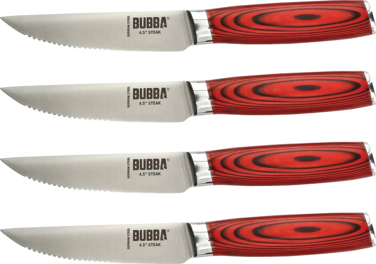 Bubba 4 Piece Steak Knife Set (1137660) – 4.5″ German Stainless Steel Satin Partially Serrated Drop Point Blade, Black and Red G-10 Handle