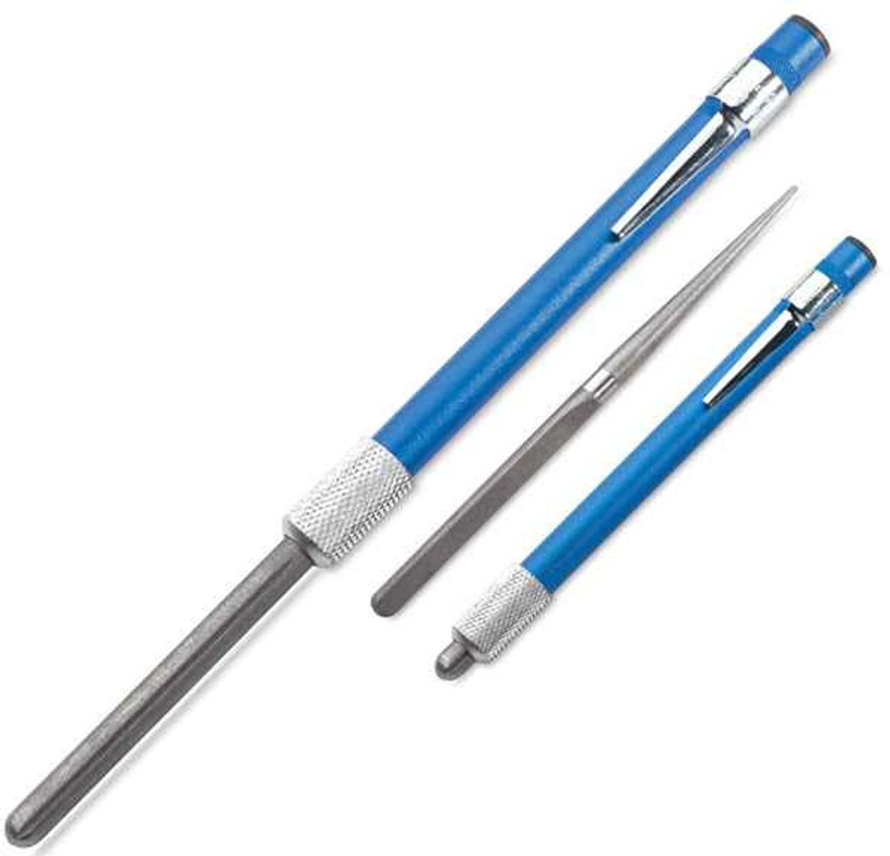 Diamond sharpener in a retractable, pen style barrel. Tapered end for serrated blades. Fish hook groove. Flat side for straight blades. Pocket clip. Portable, versatile, and durable enough for field use. Medium 400 grit.