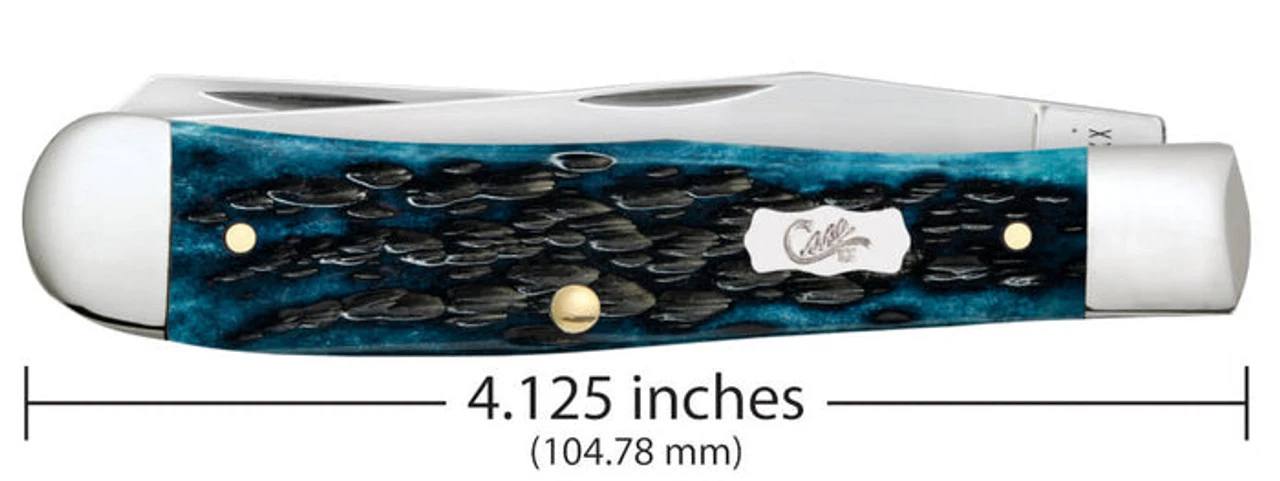 The Pocket Worn® Mediterranean Blue Bone rises to new heights of eye-catching satisfaction. Peach seed jigged for a great feel in the palm, this handle material complements the mirror-polished Tru-Sharp surgical steel blade and Case lobed shield in a rich, timeless combination of beauty and precision craftsmanship. The Trapper gets its name from the consumer it was designed for. It is a jack knife with two full length blades; a slender Clip and a long Spey. The Clip blade is commonly used as a multi-purpose blade and preferred for detail work while the Spey blade is commonly used as an all-purpose utility blade. This knife is constructed with Case Tru-Sharp™ stainless steel which is a special high-carbon steel that helps the blades hold an edge longer than conventional steel. It also offers extraordinary blade strength and corrosion resistance. Comes conveniently packaged in a box. Made in Bradford, PA, USA from domestic and imported materials.