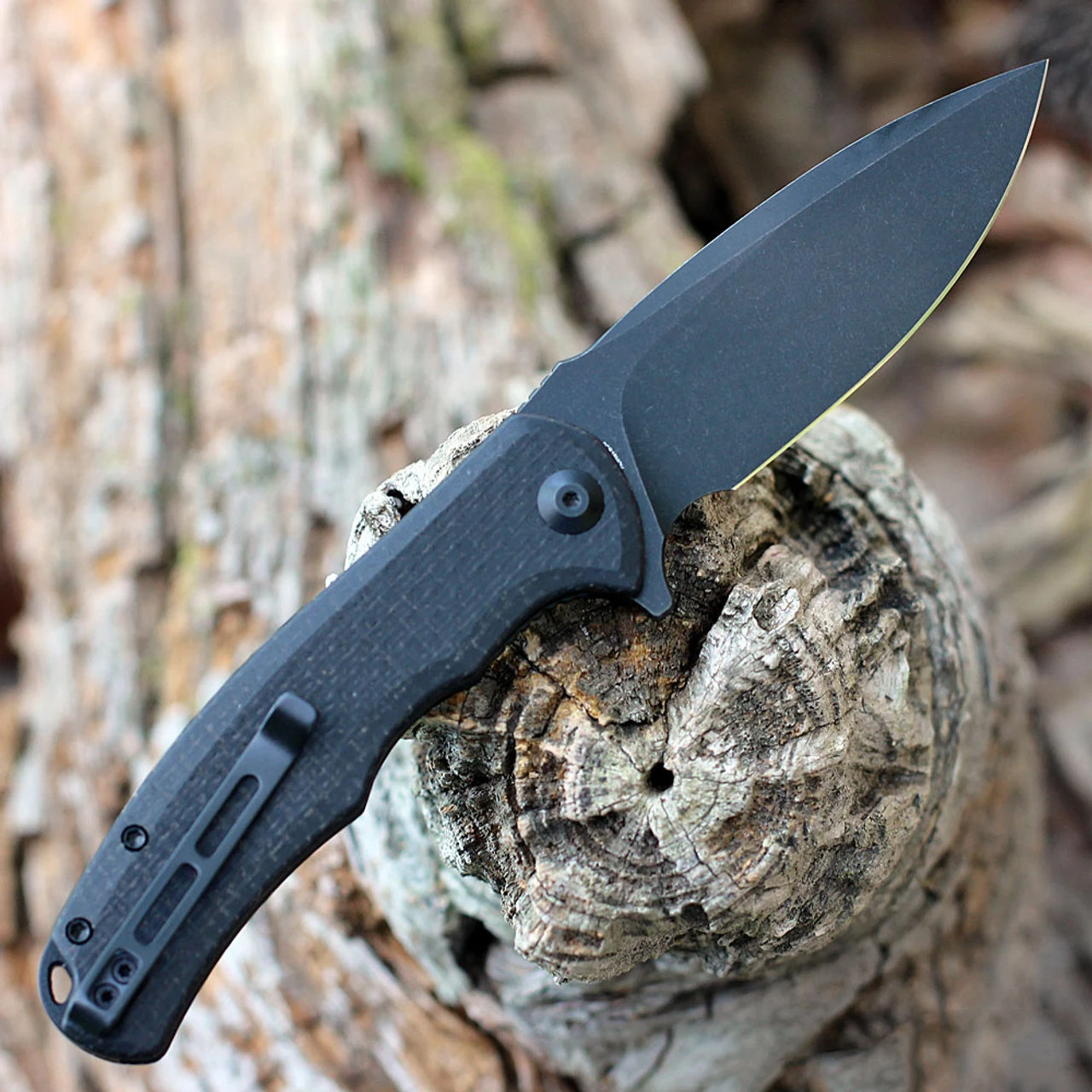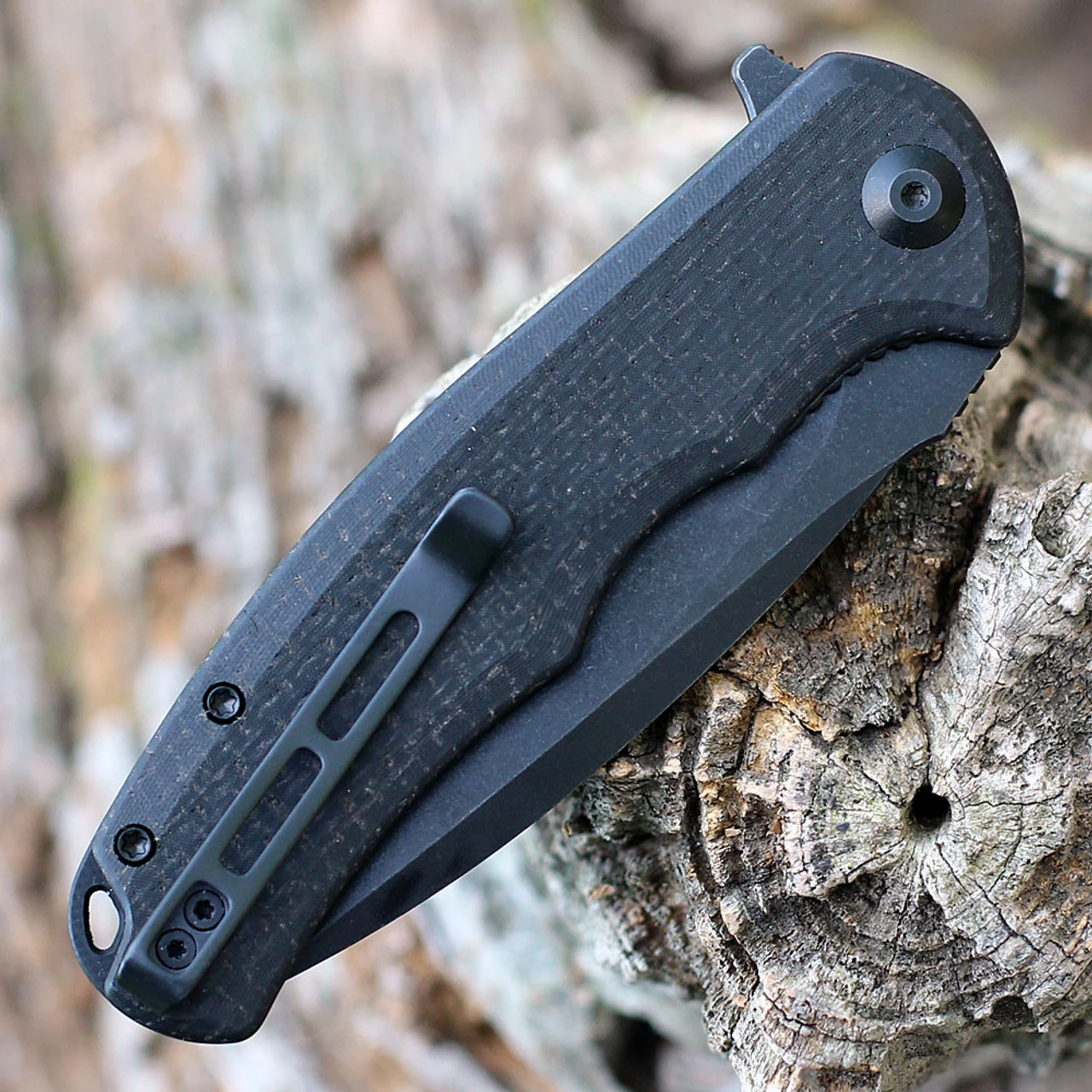 CIVIVI Praxis Flipper (C803G) – 3.75″ Black Stonewash 9Cr18Mov Drop Point Blade, Black Coarse Micarta Handle