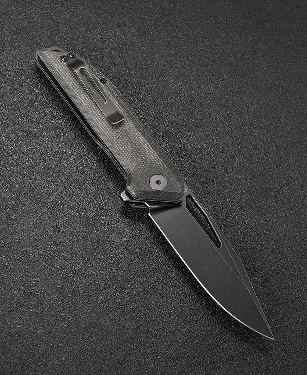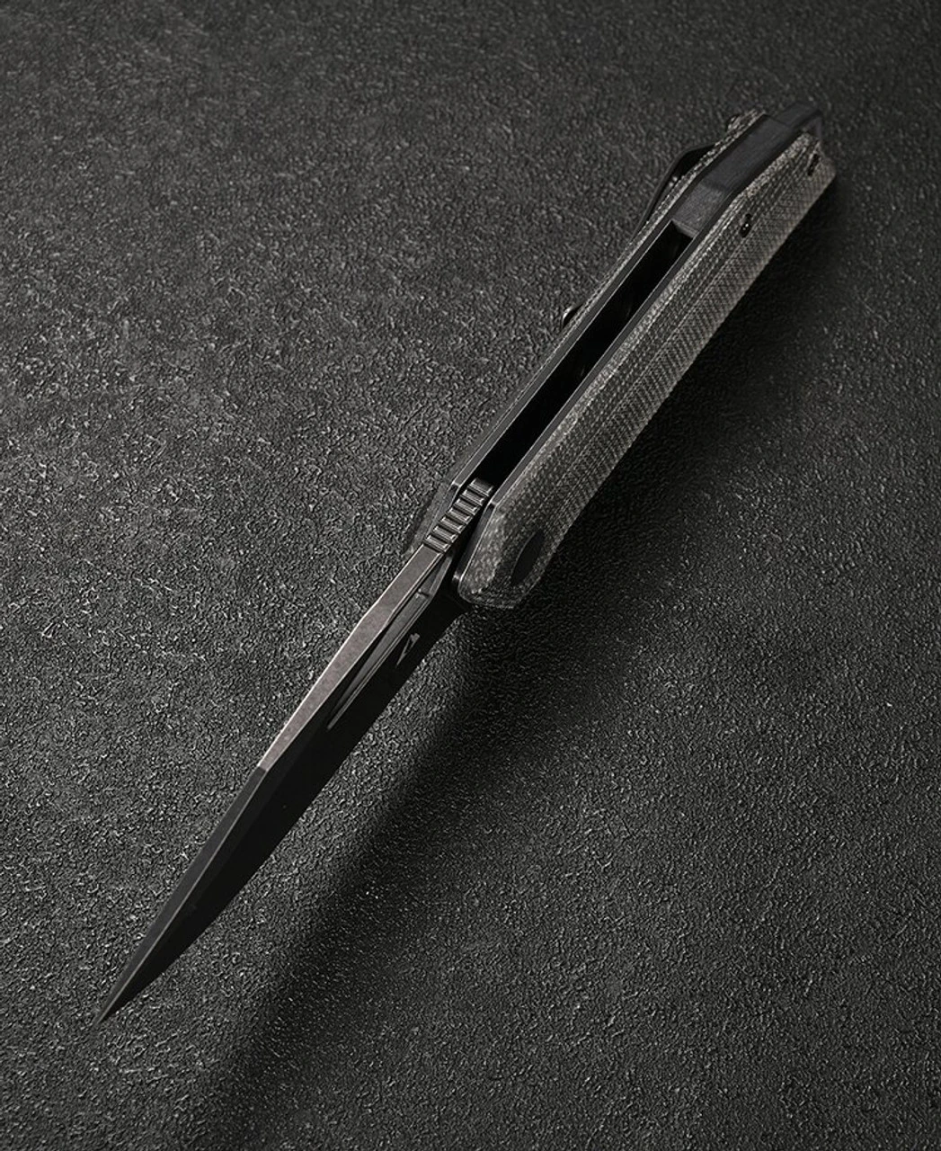 This CMB Lurker has a black blade of D2 steel and a black micarta handle.