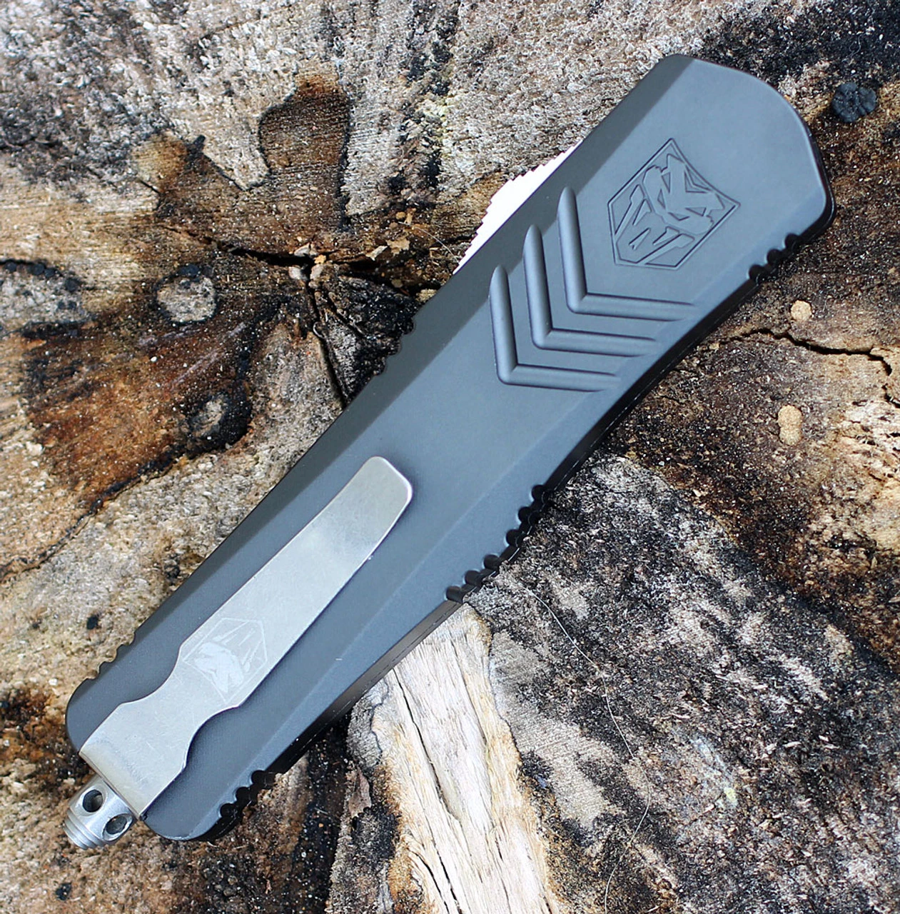 CobraTec Gray FS-X OTF Knife CTKMGRYFS-XMWNS, 3″ D2 Steel Wharncliff Plain Blade, Gray Aluminum Handle