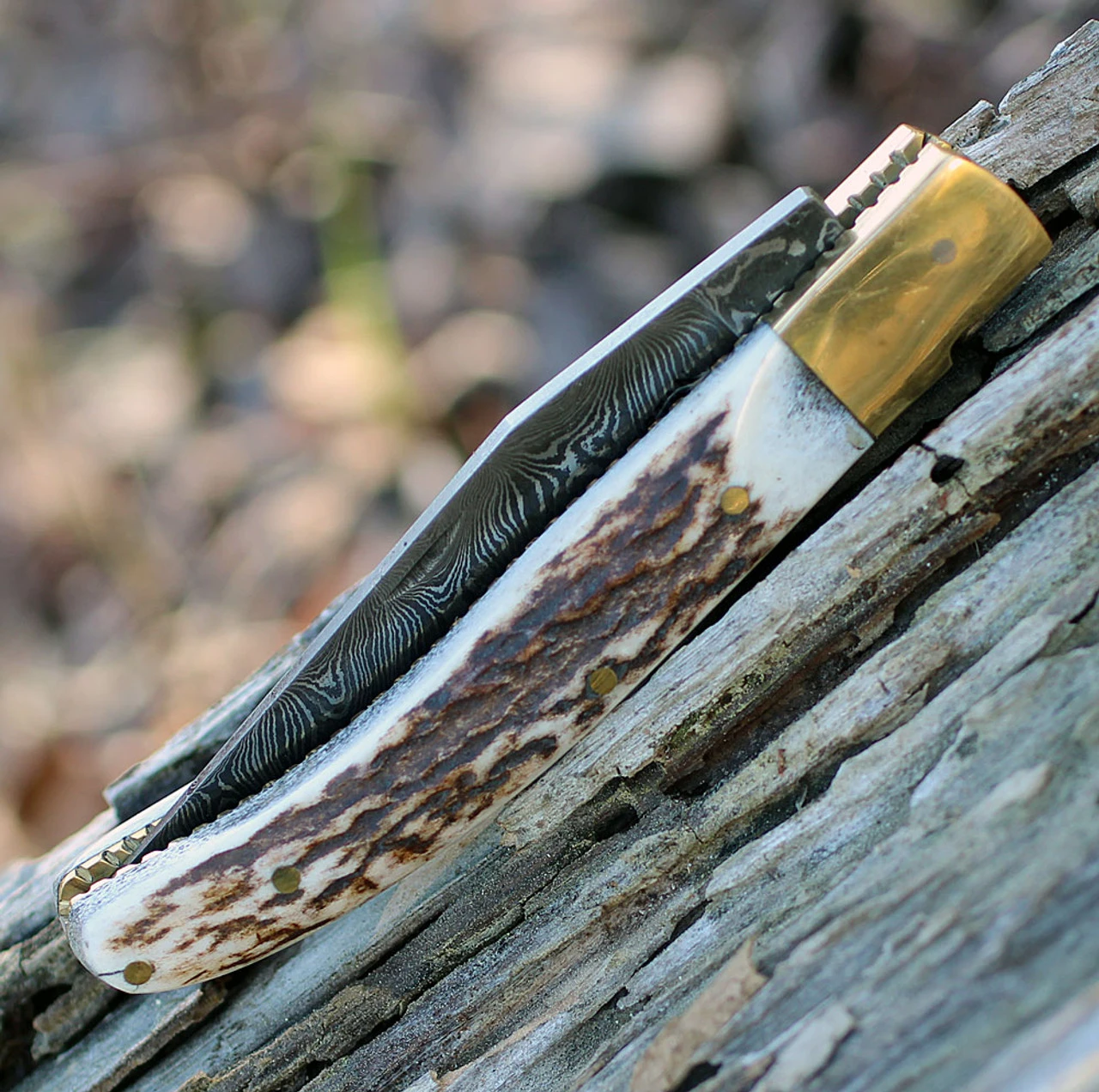 Damascus 1087 Folder, 3″ Damascus Plain Blade, Stag Handle
