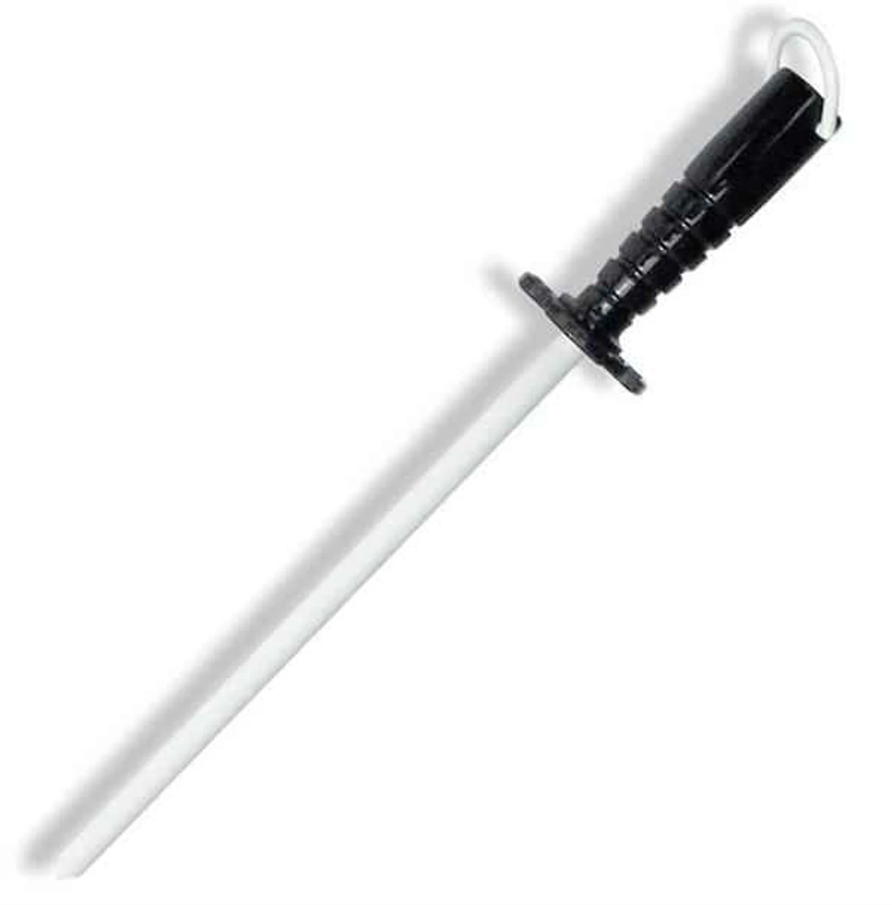 Unbreakable Ceramic Steel, Sanitary Black Plastic handle with a large guard and easy to hang up white ring. The 7 micron grit, unbreakable, wear resistant, light and nonporous ceramic is the next step to achieving a polished edge. Manufactured using the patented CeraFuse process.